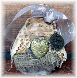When I opened up the box of bottles I won at auction I discovered this little bottle with a heart already affixed. No matter what I tried I could not remove the heart. While looking and thinking I realized this is much like faith... our heart must be rooted and grounded. However, even the most stalwart human heart is not forever fixed, only one heart is that strong. That heart lay within humble "wrappings" but the heart itself was the heart most worth knowing.